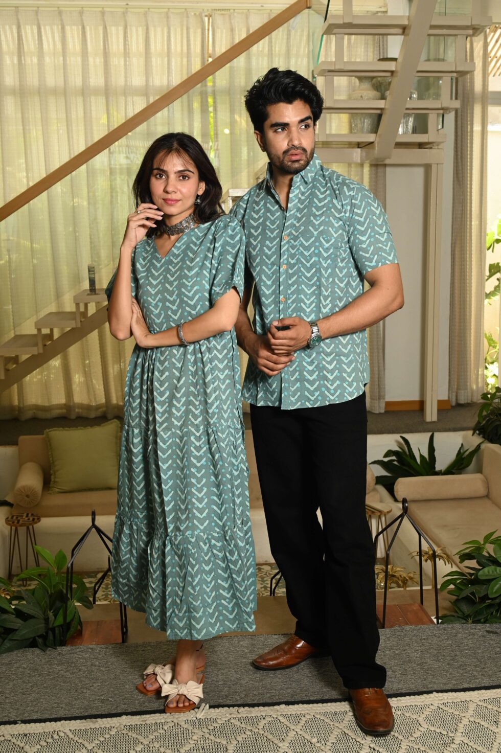 A refreshing green cotton outfit with a modern arrow-inspired print. The woman?s puff-sleeve dress and the man?s collared shirt create a stylish, casual-yet-classy matching look for outings, vacations, and everyday wear.